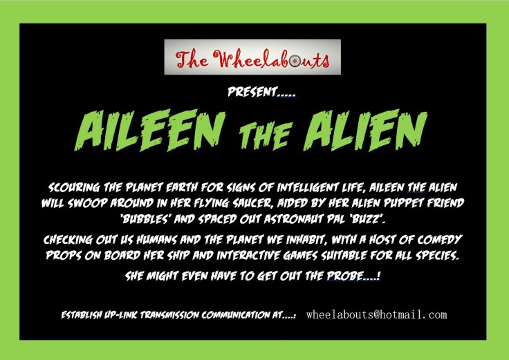 Following on from 2 successful shows running over the last 10 Years (The Phoenix and Boudicca), The Wheelabouts are now reaching for the stars with – Aileen The Alien…..